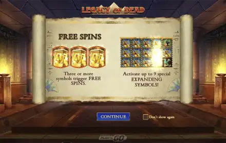 A demo mantém todo o conjunto de funcionalidades que caracterizam este slot. As rodadas grátis são ativadas pela combinação Scatter/Wild, revelam a escolha do símbolo expansível e demonstram como o caça-níquel gera grandes ganhos através dos símbolos que preenchem todo o tambor. O bónus Legacy of Dead Demo mostra como o ciclo de bónus é reiniciado e adiciona novos símbolos expansíveis ao conjunto ativo.
